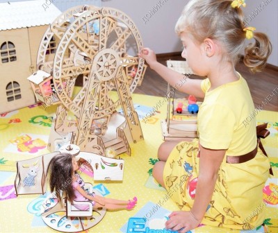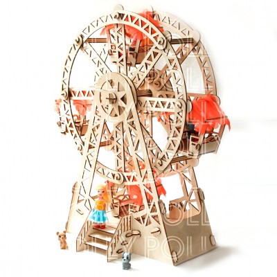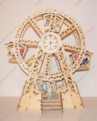 Изготовлено из фанеры, в колесо обозрения можно сажать фигурки и кукол высотой до 12 сантиметров. Высота в собранном виде: 57 см.
