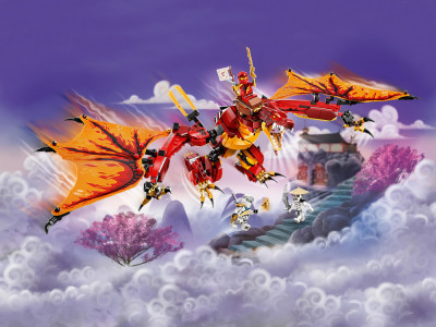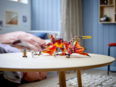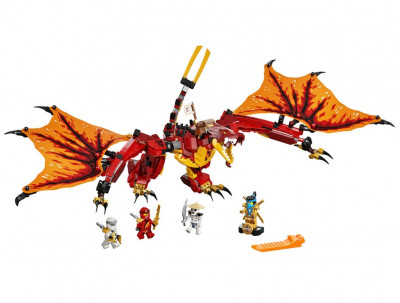 В наборе Ниндзяго Огненный дракон есть минифигурки Кая, Зейна и их антагониста — генерала скелетов Вайплэша. Также в коробке ты найдешь золотую коллекционную минифигурку Нии, которая выпущена к 10-летию наборов Ninjago. Она крепится на небольшую специальную подставку серии «Наследие».