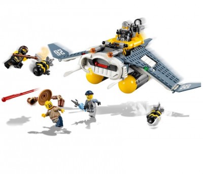 Из деталей набора Вы сможете собрать модель боевого бомбардировщика. Его корпус выполнен в бело-сером цвете с добавлением контрастных жёлтых акцентов. Спереди виден широкий нос, напоминающий открытую пасть гигантского ската. В ней кроме белых зубов и красного языка спрятаны два пружинных орудия. Чтобы их активировать, необходимо нажать на рычаги, расположенные по обе стороны от рулевого управления. Дополнительными особенностями «головы» ската служат противотуманные фары в виде глаз и аэродинамические направляющие в виде вёсел.