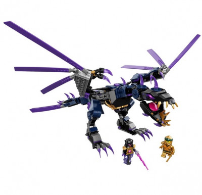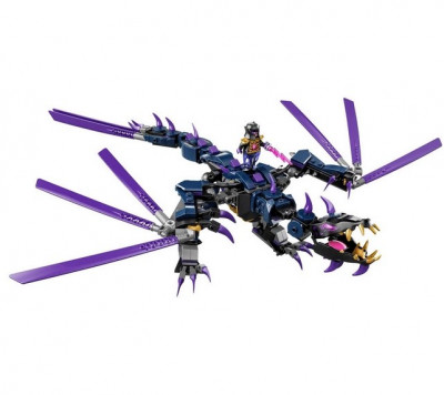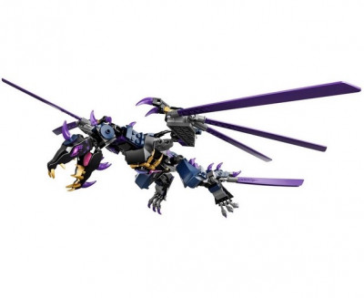 Собери дракона Оверлорда из Ninjago, выполненного в сине-фиолетовой цветовой гамме. У него широкие крылья и мощные устойчивые ноги, на голове и спине шипы, а из пасти торчат длинные клыки. На крыльях расположены клинки для нападения на врагов своего хозяина. Ноги, крылья и голова дракона двигаются, так что ты сможешь придавать ему разные положения во время боя.