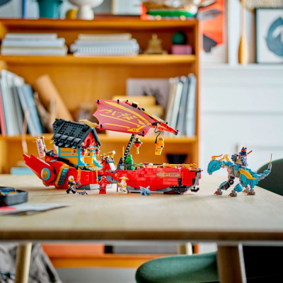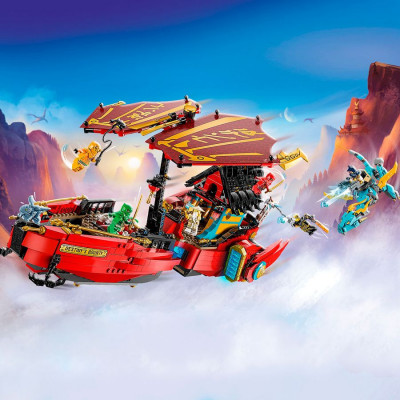 Поклонники ниндзя в возрасте от 9 лет и старше будут в восторге от игры с этим обновленным игровым набором Destiny’s Bounty — race against time. Знаменитое транспортное средство теперь представляет собой дирижабль, позволяющий ниндзя парить над недавно объединенным миром. Он оснащен съемным гнездом дракона спереди, подвижными парусами, шипометами сзади и вращающимися на 360 градусов двигателями. Крышу также можно снять, чтобы открыть навигационную комнату и игровую комнату с игровым автоматом.