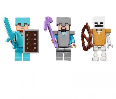 Естественно, в набор к такому масштабному конструктору входят много фигурок: Стив, Алекс, паук, волк с волчонком, слизень, 2 маленьких слизня, 2 летучих мыши, зомби, странник Края, скелет, овца и эксклюзивная фигурка заряженного Крипера. Этот моб был создан специально для этой модели. В комплекте с фигурками идут аксессуары, оружие, броня, предметы интерьера, указатели движения, часы, а также абсолютно уникальный элемент – золотое яблоко и 8 блоков с рудой разного цвета (золотая, железная, красная, изумрудная, лазуритовая, алмазная и угольная).