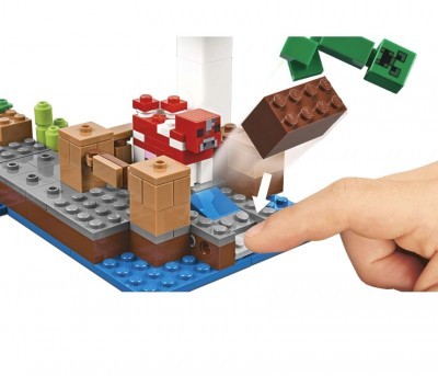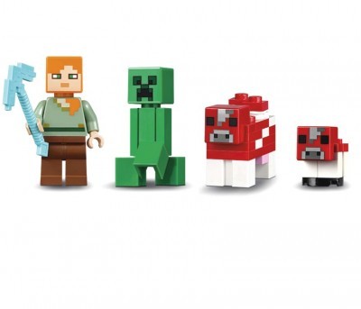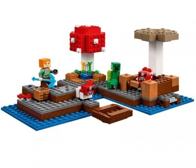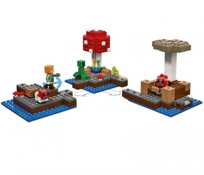 Из деталей конструктора вам предстоит построить грибной остров. Условно локацию можно поделить на три части. Левая площадка предназначена для свободного пастбища коров, хранения полезных ресурсов и инструментов. Центральная часть острова приспособлена под огород. Огромный мухомор, растущий здесь, служит защитой для растений от палящего солнца, а небольшое пресное озеро облегчает полив. В правой части острова под шляпкой другого гриба расположен загон для коров.