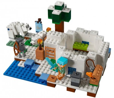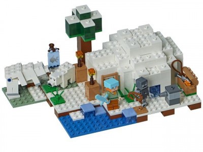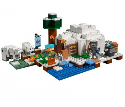 Итак, иглу собирается из белых деталей, которые имитируют снежные блоки. В стенах можно разместить симметричные ледяные окошки, которые будут пропускать свет внутрь помещения. Внутренний интерьер представлен кроватью с салатовым покрывалом, верстаком, печкой и красным факелом. Сундук с оружием и броней можно расположить здесь же или оставить снаружи. Недалеко от входа рекомендуем установить шутер. Он послужит надежной защитой от злобного моба Зимагора.