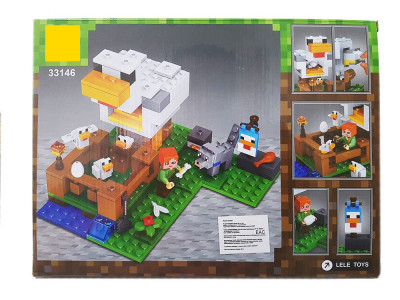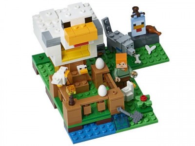 Выгоднее всего расположить его на зеленой поляне и возле водоёма, именно поэтому мы берем блоки зеленого и синего цвета в качестве основания. Затем из коричневых деталей строим бревенчатый загончик с распашной калиткой. Устраиваем крытый насест под большой фигурой курочки. В верхней части фигуры будет располагаться хранилище для готовых яиц. Хранилище оборудуем специальным механизмом, с помощью которого яички при необходимости будут выгружаться в сундук.