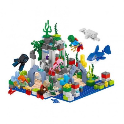 В нашем магазине можно купить конструктор Майнкрафт подводное царство. В наборе вы найдете Алекс, деревенского жителя, свиночеловека, зомби,, осьминога рыбу-меч и акулу. Сюжет - приключения под водой.