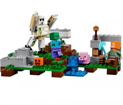 В набор входят детали конструктора и четыре фигурки (железный Голем, зомби, Алекс и свинка).