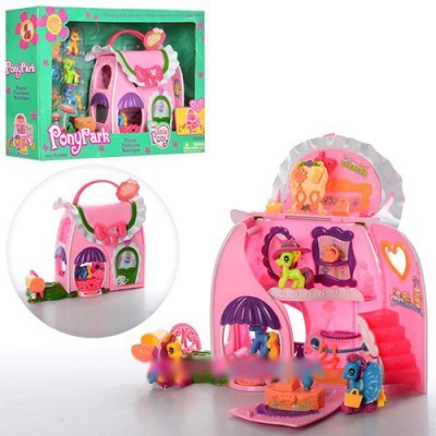 Домик для пони Pony Park ― это очень красивый, яркий и необычный игровой детский набор! Домик My little pony очень интересен тем, что любимых пони можно переносить в нем, ведь он выполнен в виде сумочки. Сумочка имеет возможность открываться. Внешне домик-сумочка очень привлекательная, с красивым окошком, дверцей, а сверху домик украшен милым розовым бантиком!