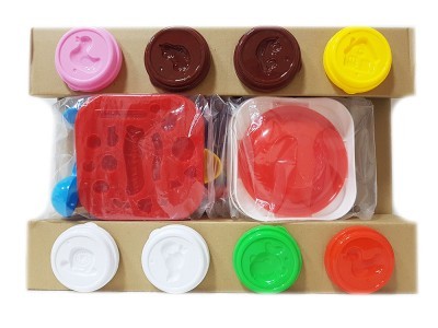 Комплект: формочки для лепки, аксессуары, 8 баночек пластилина, инструкция.