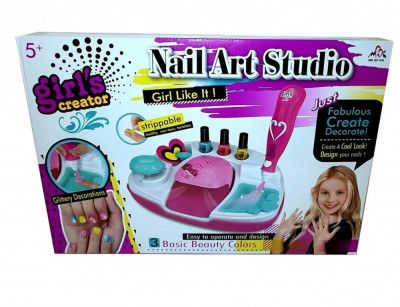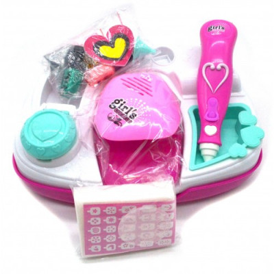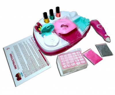 Большой детский творческий маникюрный набор для декорирования ногтей и других предметов: вместительная подставка, 3 цвета лака, 2 пакетика с блестками, воронка, губки, накладки, шаблоны, пилочка, сушка и распылитель блёсток (работают от батареек), инструкция.