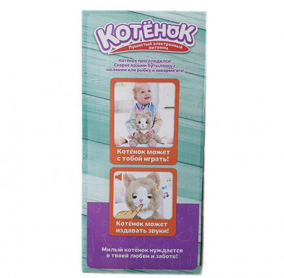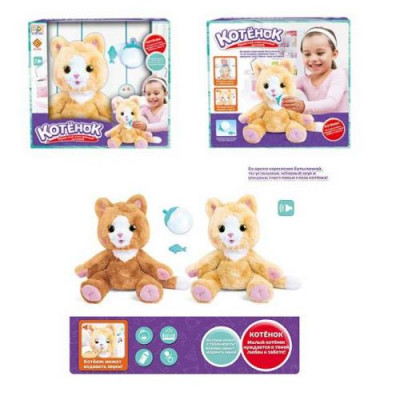 Этот очаровательный маленький интерактивный котенок нуждается в том, чтобы его покормили и заботились о нем. Когда котенок кушает из бутылки, то он закрывает глаза и мурчит. Встряхните бутылку для забавного эффекта! Продолжайте кормить его и он заснет с самыми симпатичными спящими звуками. Выньте бутылку из его рта и котенок проснется, а глаза откроются. Теперь пора играть с этим мягким, симпатичным котенком!Кажется, что этот питомец настоящий! Котенок любит ласку и заботу, его можно кормить из бутылочки, гладить и обнимать. У котика огромные добрые глаза, очень мягкая, приятная ощупь шерстка , нежно-розовые подушечки лап, ушки, носик и ротик.