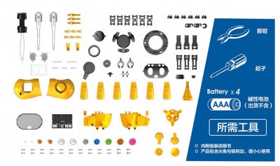Для начала игры, следует по схеме, соединить различные детали воедино. Для работы пригодятся папины инструменты – кусачки и крестовая отвертка. В движение робота приводят 4 батарейки типа ААА, которые приобретаются отдельно.