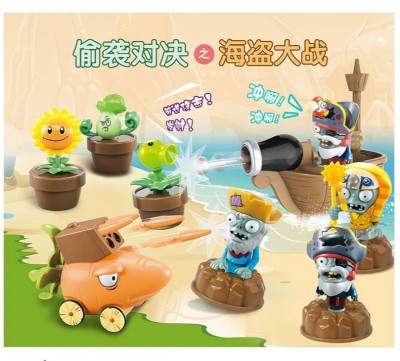 В комплекте: инерционные машинки Зомби пират и морковь, могут стрелять, 3 фигурки растения в горшках (вынимаются), 3 фигурки зомби в лунках (вынимаются)